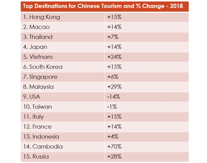 Comparing Chinese arrival numbers for 2018 with those from 2017, we see particularly strong growth from Africa, Latin America, Southeastern Europe, Turkey, and Southeast Asia. Northern European countries Norway and Sweden didn’t fare as well – in part because potential tourists headed to World Cup host Russia instead. Exotic island destinations like the Maldives and the Seychelles also saw declining or flat numbers. COTRI Analytics cites a 14% decrease in Chinese tourism to the US, even worse than the 5.7% decline reported by the National Travel and Tourism Office, or the 10.1% identified by Forbes – the CMR points to rising US visa rejections as the key factor.