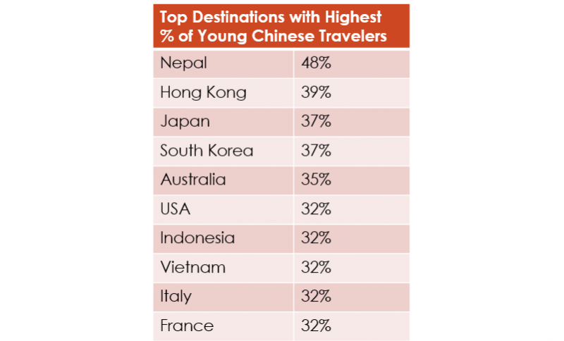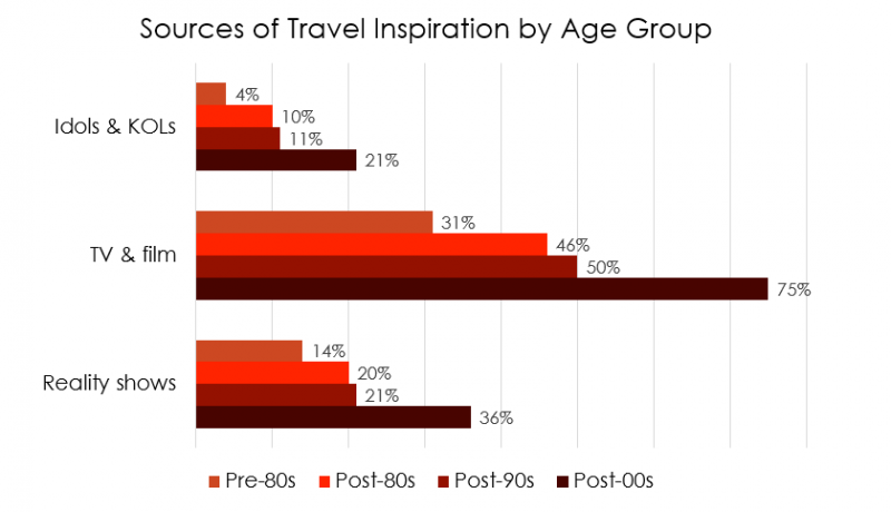 In terms of inspiration sources for travel, based on Qyer.com data, Chinese born in the 1990s showed similar results to those born in the 1980s. But Chinese born in the 2000s were much more likely to be influenced by reality TV shows (36% vs. 21% for the post-90s generation), TV & film (75% vs. 50%), and idols & KOLs (21% vs. 11%). While Chinese generations are generally broken into decades or even periods of five years, these results show that “millennial” and “gen-z” categories are indeed relevant in a Chinese context.