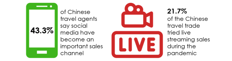 The report describes the 24-hour connectivity of WeChat as “a ray of sunshine during the pandemic,” explaining how social media allows travel professionals to send information and answer questions no matter where they are or what time it is, increasing efficiency. The idea of being available 24 hours a day certainly has some downsides when it comes to work-life balance, but the report makes the valid point that for communications during this crisis period, “one WeChat group can give you the same result as 500 phone calls,” referring to the maximum size of a chat group. 43.3% of travel agents say that social media platforms including WeChat, Douyin, and Xiaohongshu have become an important sales channel for them.