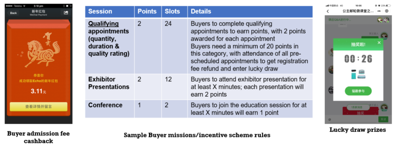 How was this achieved? After every virtual 1-on-1 meeting, a pop-up survey asked exhibitors to rate the buyer. Buyers got bonus points if they achieved an average rating of good or above by the end of the event. Rewards included eligibility for lucky draw prizes to be rewarded at scheduled times – increasing engagement at those times as well – and automated refunds of the buyer admission fee in increments via WeChat. Only the most engaged buyers might win back their entire admission fee.