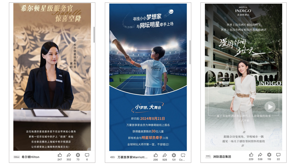 (Left to right) Hilton’s “star service officers” series; Marriott’s Shanghai Masters giveaway; InterContinental’s promotion of Indigo hotels with brand ambassador Charmaine Sheh
