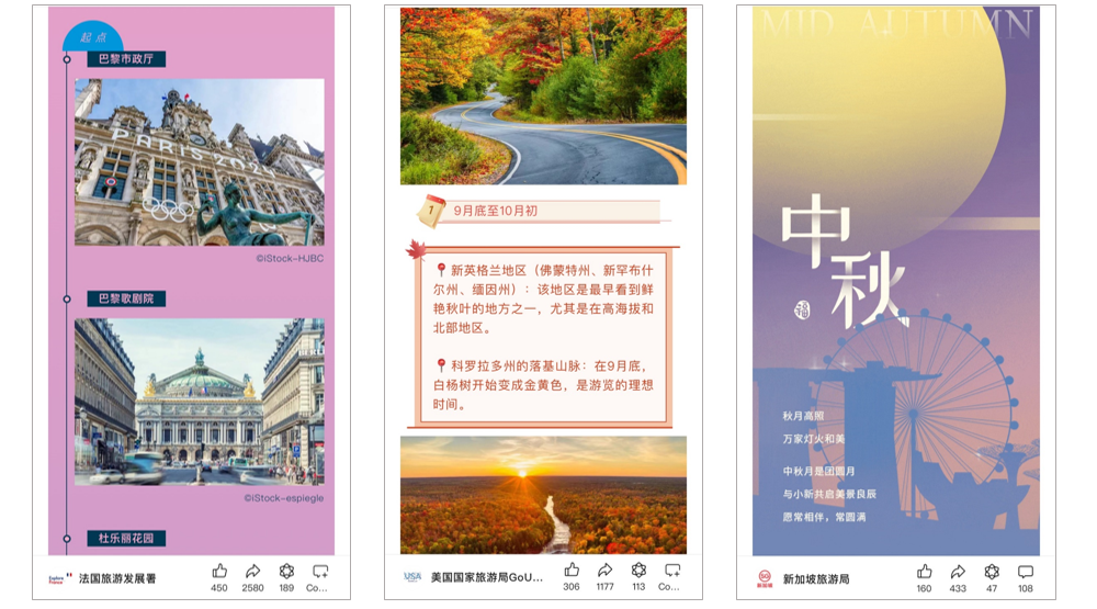(Left to right) Atout France’s post at the end of the Paris 2024 Olympics; fall foliage guide from Brand USA; Mid-Autumn Festival wishes from the Singapore Tourism Board