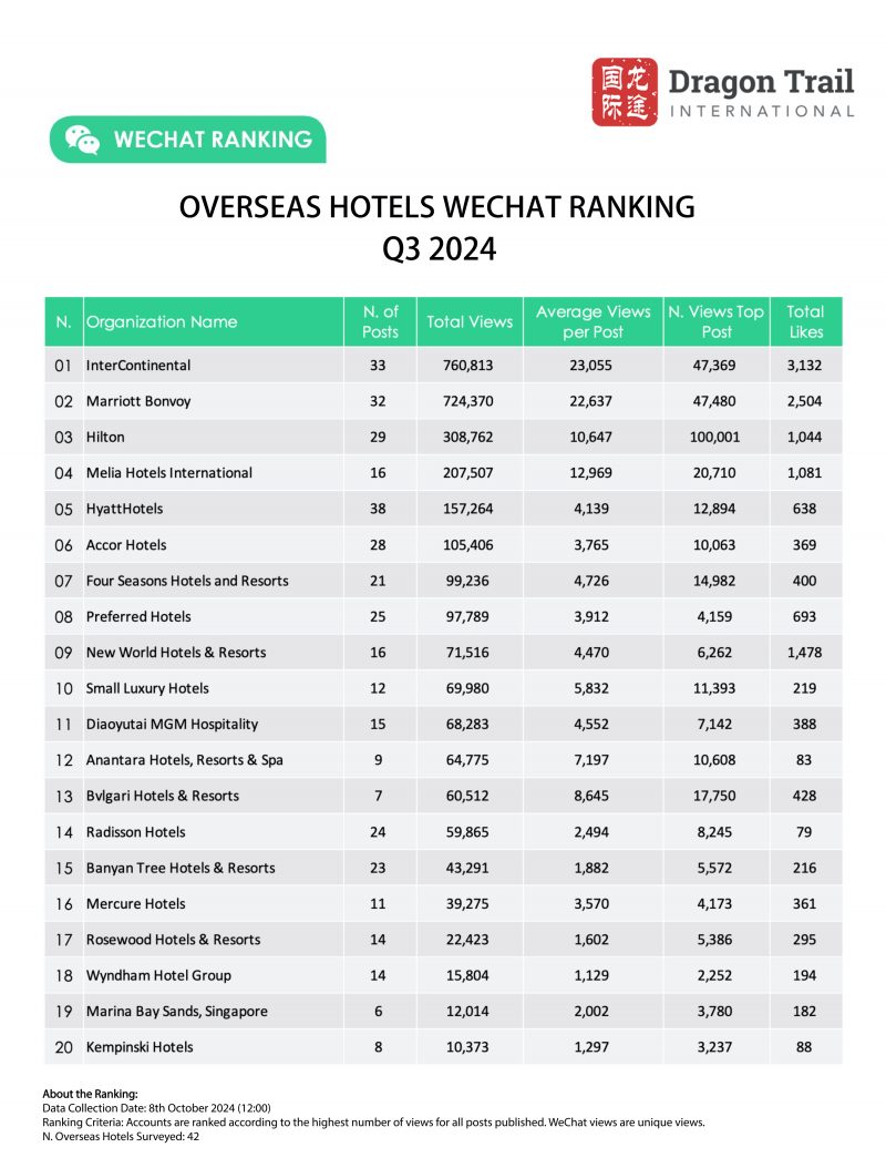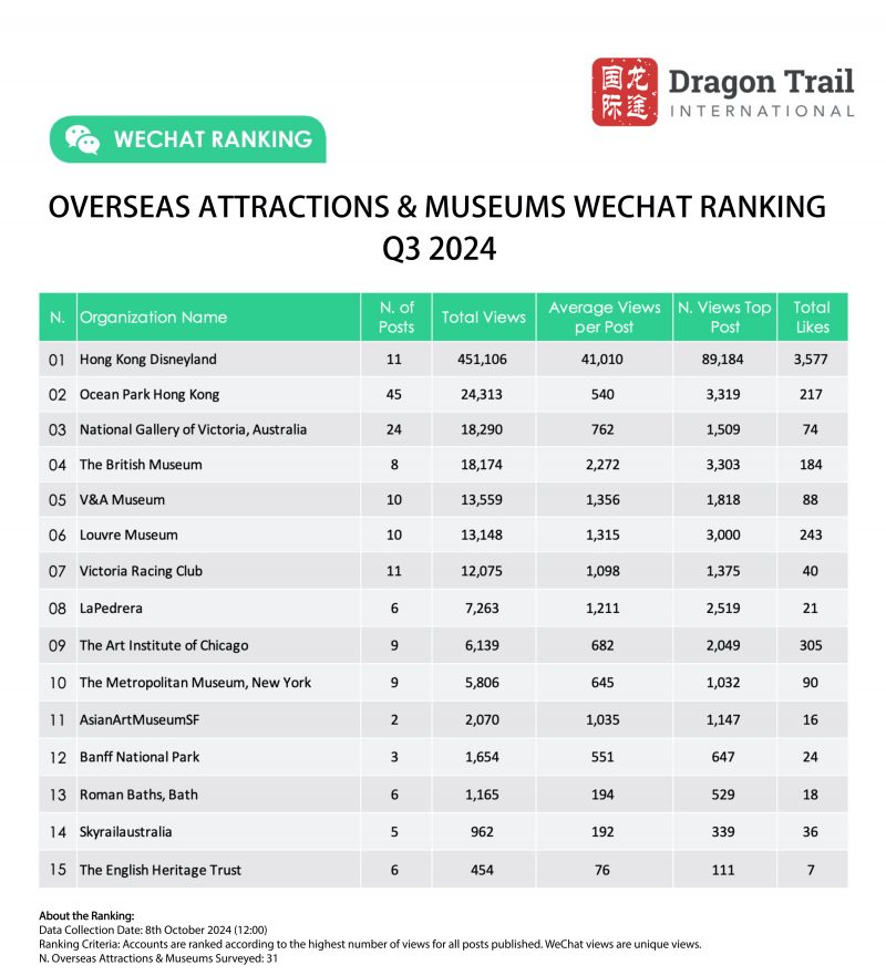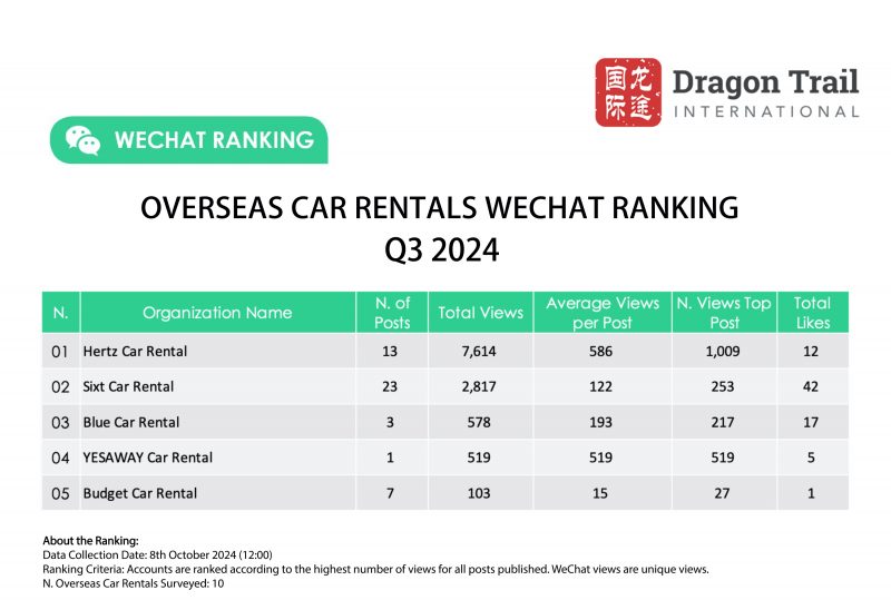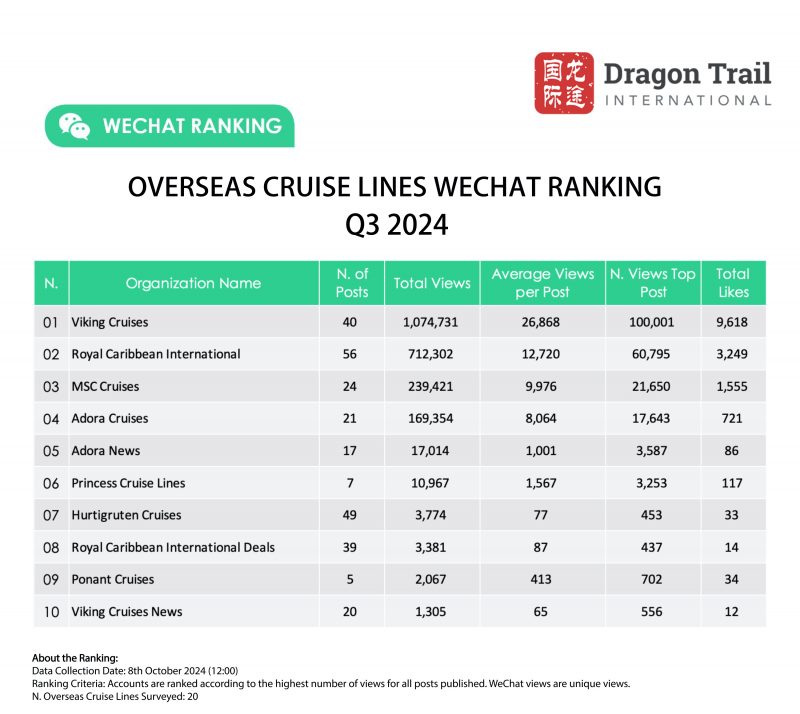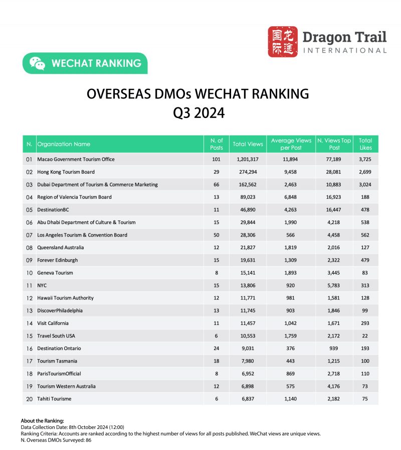 Dragon Trail has tracked the accounts of national tourism boards (NTOs), regional and municipal tourism boards (DMOs), international airlines, and international cruise lines on WeChat since 2017. We added international hotels and museums & attractions in 2019, and our two new categories for 2024 are overseas airports and car rental companies.