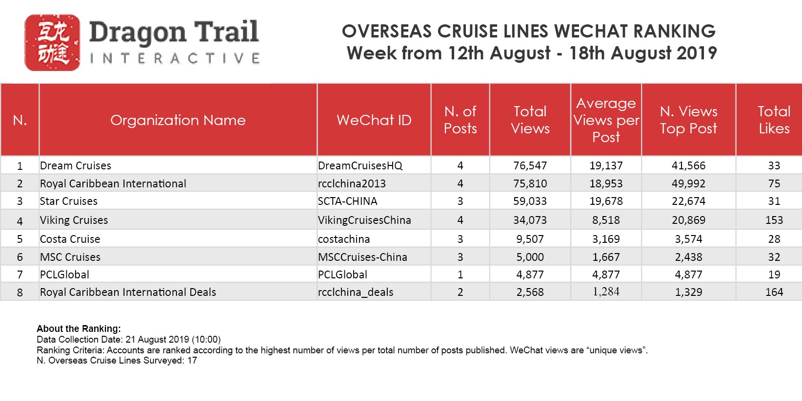 WeChat Weekly Rankings: Destinations, Airlines, Cruises, Attractions and Hotels – 12 August – 18 August 2019