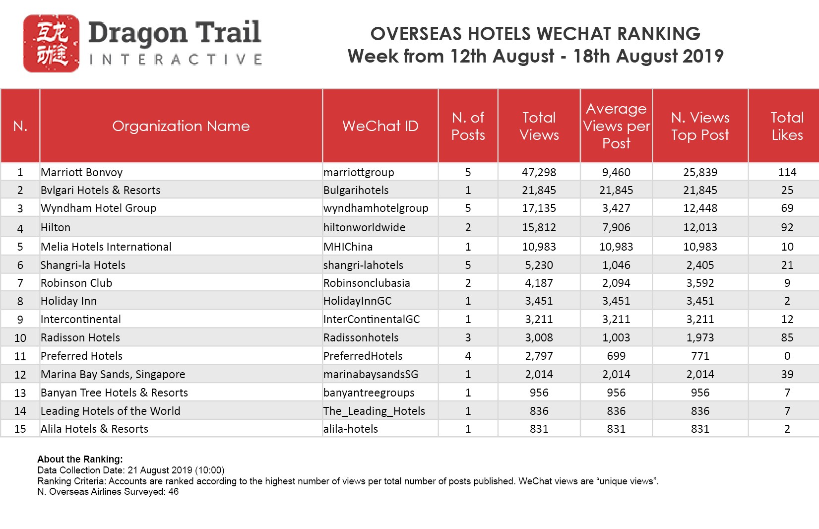 The top-ranking WeChat accounts for travel destinations, airlines, cruise lines, museums & attractions, and hotels, for the week of 12 August-18 August, 2019.