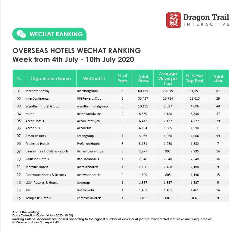 The top-ranking WeChat accounts for travel destinations, airlines, cruise lines, museums & attractions, and hotels, for the week of 4 July - 10 July, 2020.