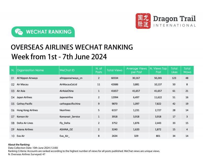 The top-ranking WeChat accounts for travel destinations, airlines, airports, cruise lines, museums & attractions and hotels for the week of 1-7 June 2024.