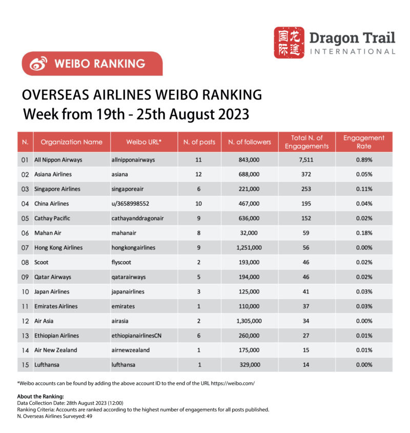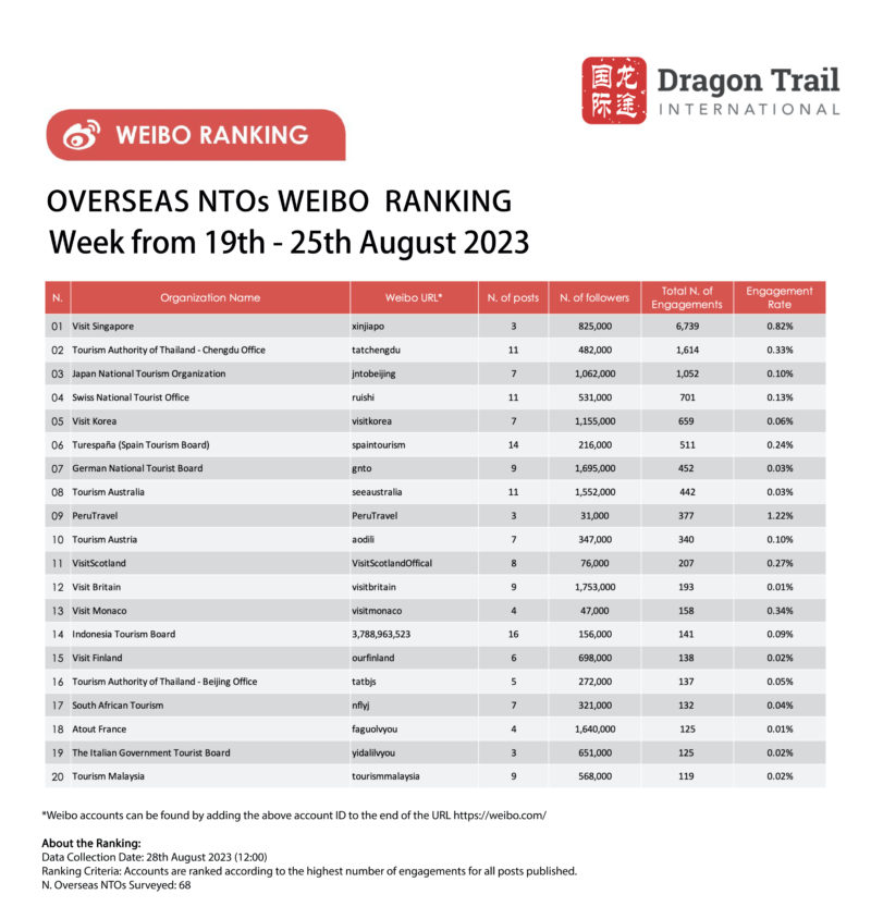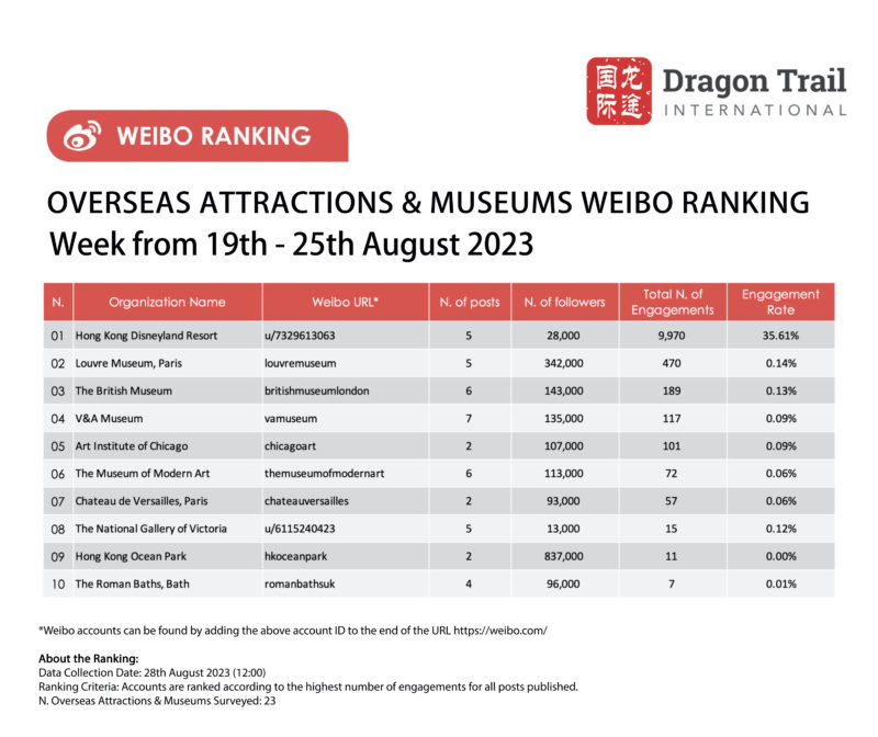 The top-ranking Weibo accounts for travel destinations, airlines, cruise lines, museums & attractions, and hotels, for the week of 19-25 August 2023.