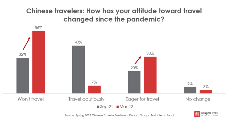 The timing of our spring 2022 sentiment survey came at a point where global pandemic controls were being lifted significantly, but Chinese domestic outbreaks were on the rise. News reports in China showed the advent of war in Europe. Under these circumstances, it’s not surprising that more than half of survey respondents were not planning to travel.
