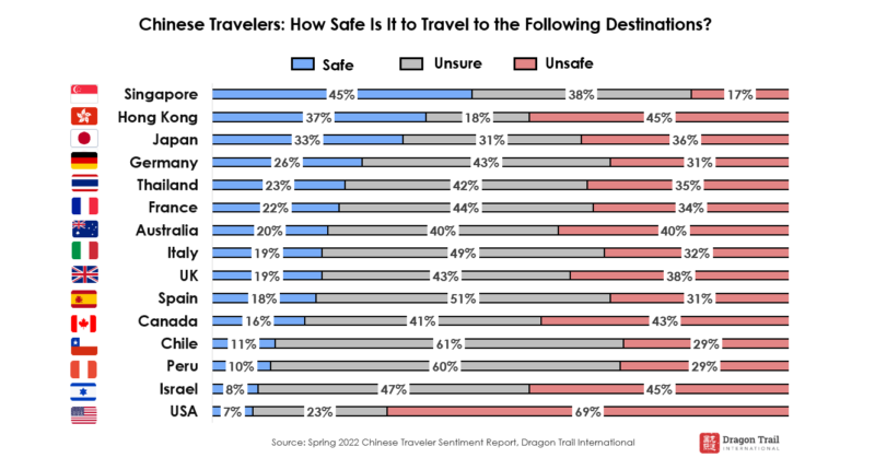 Yet at the same time, sentiment around “eager to travel” also grew significantly since Dragon Trail’s last traveler survey in September 2021. Perceptions around the safety of international travel destinations also improved across the board – for each and every country on the list.