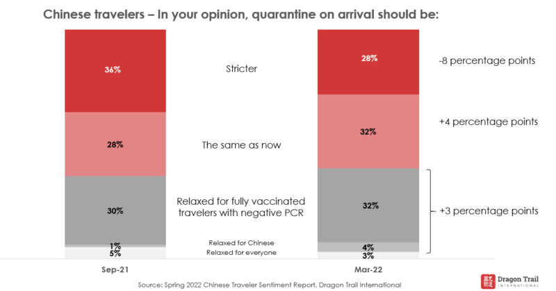 Quarantine-on-return remains the biggest obstacle to outbound tourism, and our spring 2022 survey reveals shifting attitudes towards this policy. Compared to September 2021, an increasing number of travelers would prefer quarantine to either be relaxed or stay the same, with fewer calling for stricter measures. At the time of writing, it has been announced that a number of cities in China will in fact reduce hotel quarantine for inbound travelers to 10 days, down from 14.