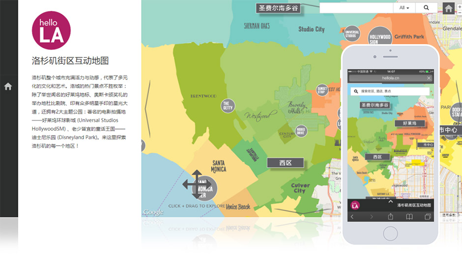 In order to make it easier for visitors to better visualize all points of interest throughout the different neighborhoods, Dragon Trail developed a city map for LATCB’s English website, Discover Los Angeles, and later localized it for Hellola.cn, its China-dedicated website. Because of the restrictions on accessing Google Maps in China, the map has been created in OpenStreetMap (OSM) technology, an open-license system that’s accessible in both countries.