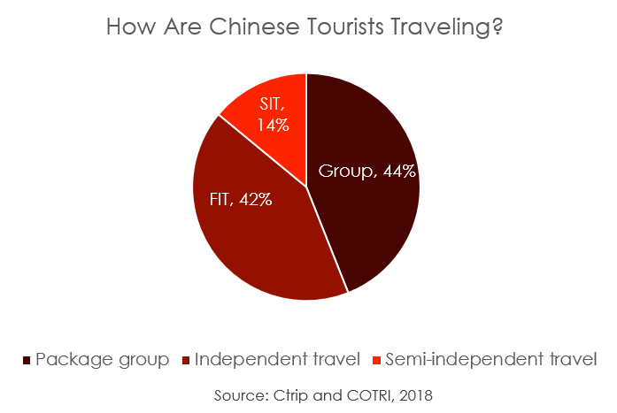 4) In H1 2018, 42% of leading Chinese OTA Ctrip’s sales have been for FIT products, with 44% for package group tours, and 14% for private group tours and customized travel. Strong growth in FIT to destinations like Australia necessitates the development of services to cater to independent travelers, such as Chinese mobile payments and the availability of Chinese-language information, accessible through QR codes.