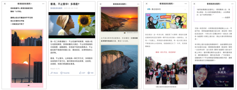 Hong Kong’s top WeChat content (left to right): Sunsets, a tourism marketing video, the SAR’s “wild” side, an article by KOLs Traveling Sisters, and an online tribute concert to Leslie Cheung