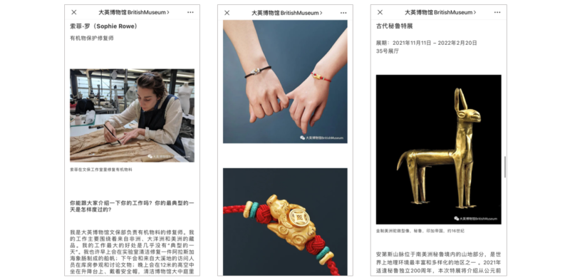 2021’s top WeChat posts by The British Museum: (left to right) Women working at the museum, holiday gifts, and annual exhibition guide