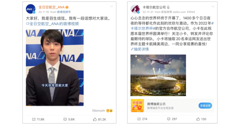 For All Nippon Airways, the key to high Weibo engagement is the airline’s partnership with figure skater Yuzuru Hanya, who is wildly popular in China. Posts around the Winter Olympics, announcing his retirement from competitive skating, and celebrating his birthday all received thousands of engagements.