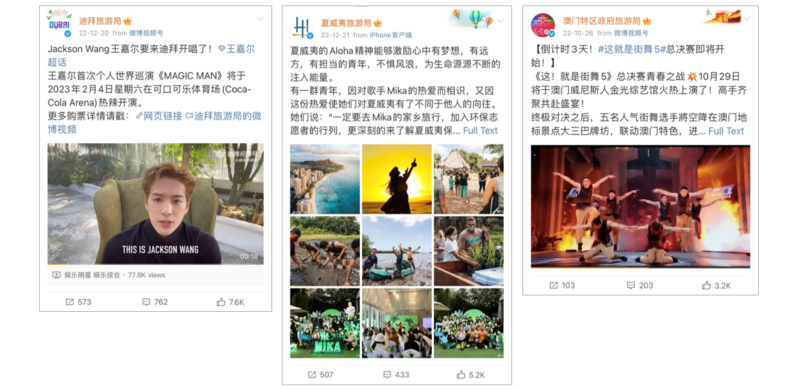 Exactly like the NTO category, the DMO Weibo post with the most engagement in 2022 was about pop singer Jackson Wang. In this case, it was a video shared by Visit Dubai to announce his 2023 concert. Other top DMO posts for the year included photos celebrating boy band singer Mika Hashizume from Hawaii, videos promoting street dancing and celebrity dining TV shows from Macau, singing performances shared by Hong Kong and Dubai, and a poll about Korean TV shows from Visit Busan.