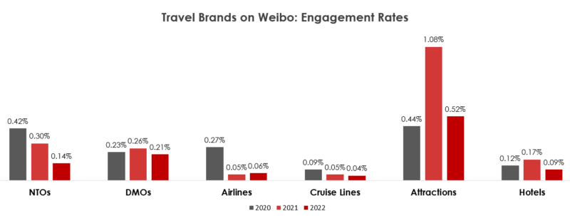 Apart from the airline category, the total number of engagements and the engagement rate declined for all types of travel brands compared to 2021. Average engagement rates for all categories were also lower than in 2020, with the exception of Museums & Attractions. This category had a sharp rise in engagement rate in 2021 because Hong Kong Disneyland joined Weibo towards the end of the year – with low follower numbers but a large number of engagements, this account skewed the average for the year.