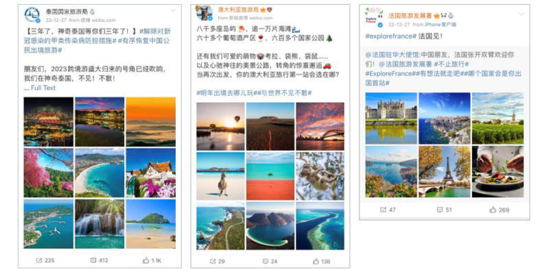 Looking at the last week of the year – when China’s reopening plan was announced – the NTO account category was fastest to respond to the news. The “welcome back” posts with the highest engagements came from the Tourism Authority of Thailand and the French Embassy in China (reposted by Atout France). Other NTOs celebrating the news included Spain, Serbia, Norway, Canada, Australia, and New Zealand.
