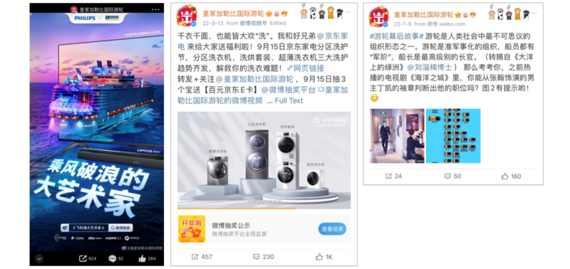 Engagements continued to drop in 2022 for the cruise line category. In fact, only three posts by cruise lines received 100 or more likes during the whole year. All of these were posted by Royal Caribbean International, and none of them related to any cruise product. The first was an ad for washing machines and a giveaway with JD.com, the second was a giveaway of Philips headphones, and the third was a guide to maritime uniforms for viewers of the TV series “One Boat One World.”