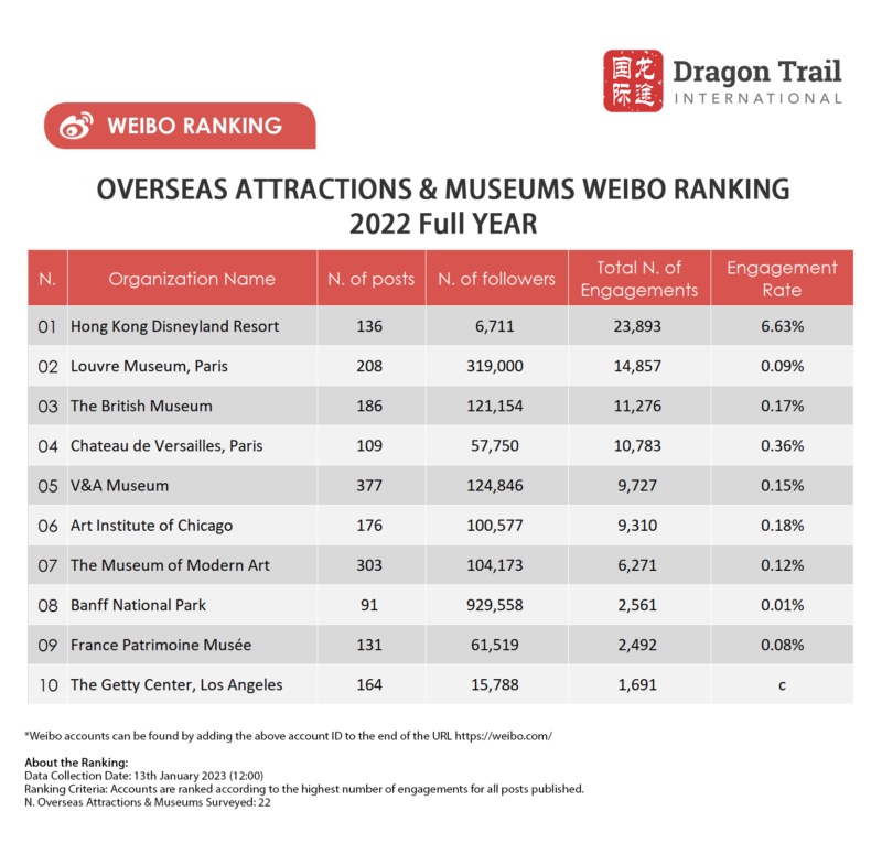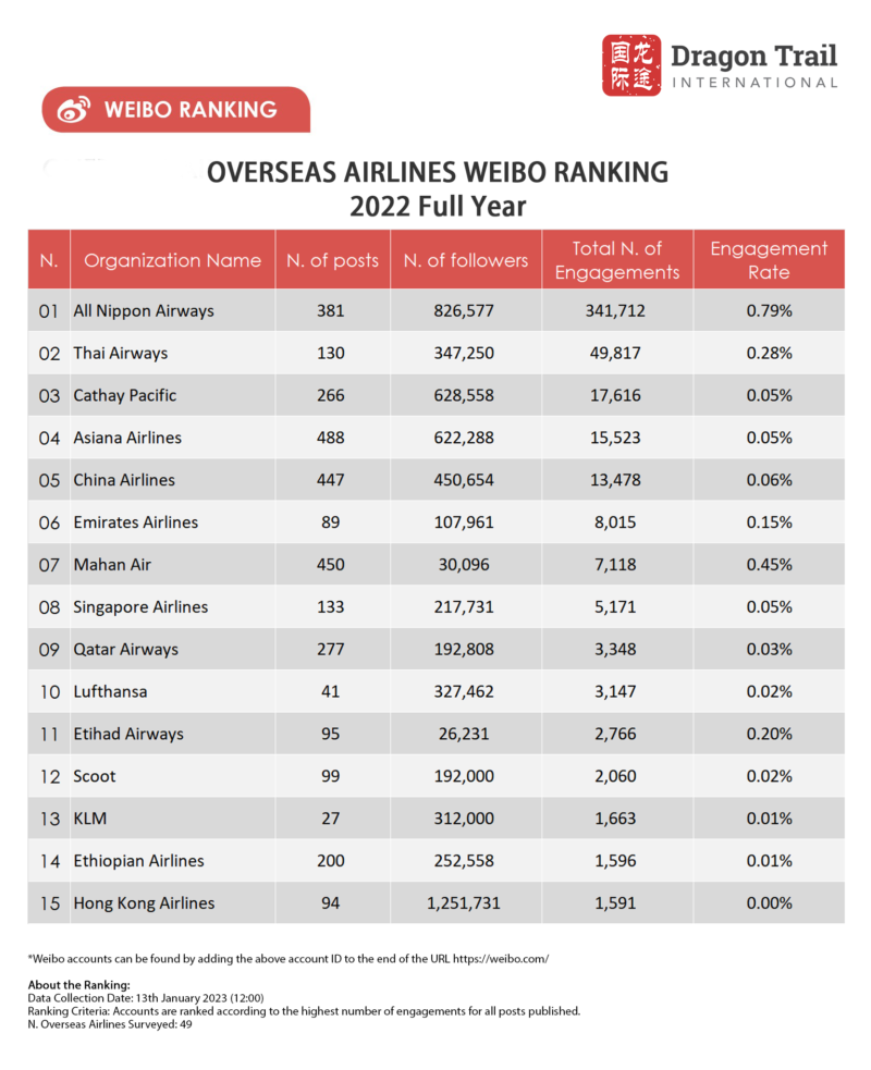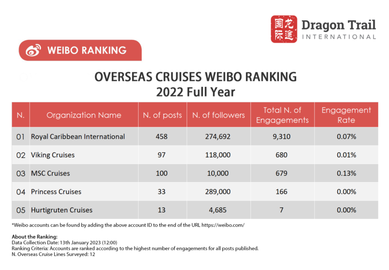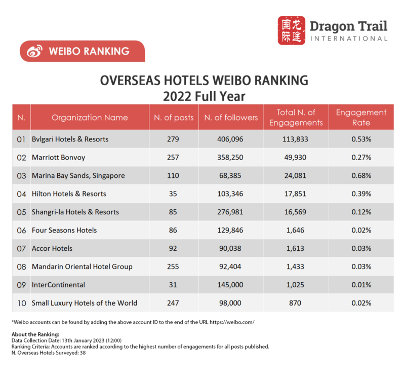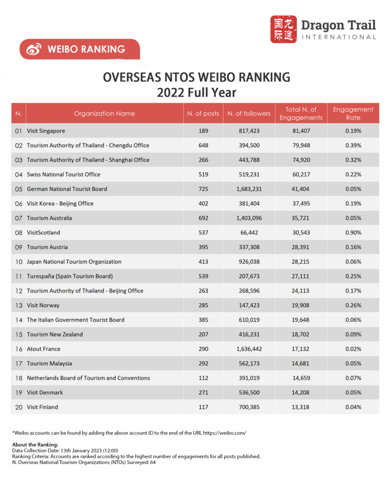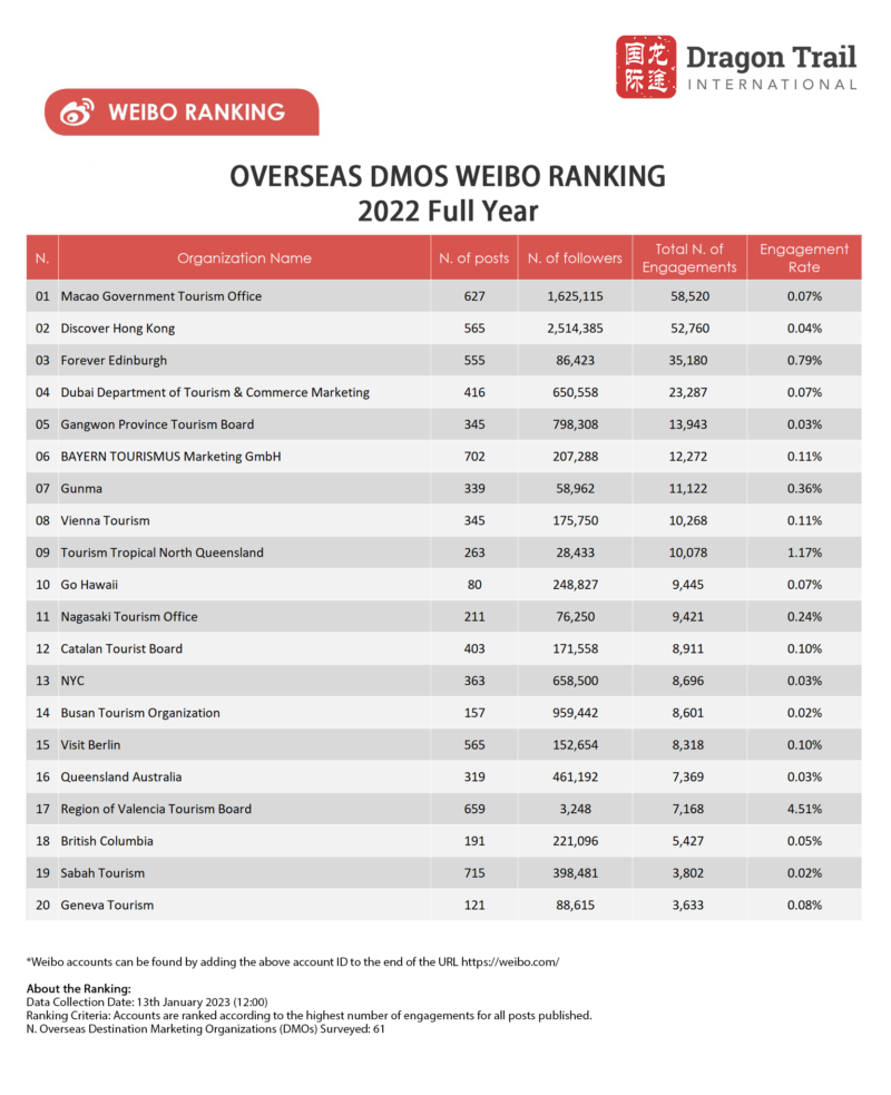 Dragon Trail’s Weibo Rankings for Travel were launched at the end of 2019, so most of our data on this social platform has been from the pandemic years. We expect much more interesting campaigns, trends, and results in 2023, as well as healthy recovery of traveler interest and Weibo engagement rates.