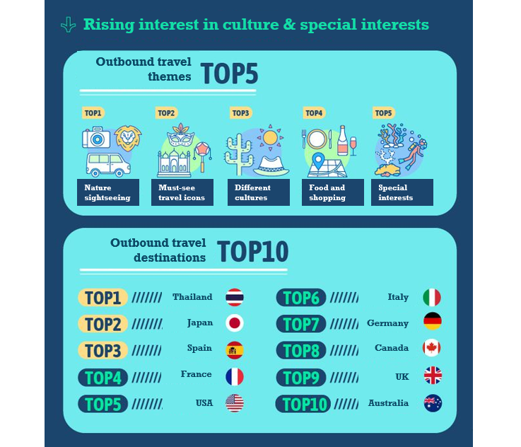 Looking at what Qyer users want to do when they next travel abroad, seeing nature and must-visit icons were the top two themes. But experiencing different cultures and exploring special interests were the fastest-growing travel themes.