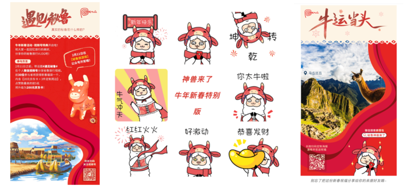 Peru is one of just a few international tourism boards that its own collection of WeChat stickers, launched in August 2020. For Chinese New Year, they added eight new stickers for the holiday, featuring an alpaca with both traditional greetings and puns using the word for ox. The WeChat stickers were introduced and could be saved from an article that also included a fun, interactive giveaway. Readers could make their own Chinese New Year poster by sliding different parts of the image with their fingers to choose a greeting, an image of Peru, and alpaca character. To enter the giveaway, they had to save the poster they created, and send it to PromPeru’s WeChat account in a message.