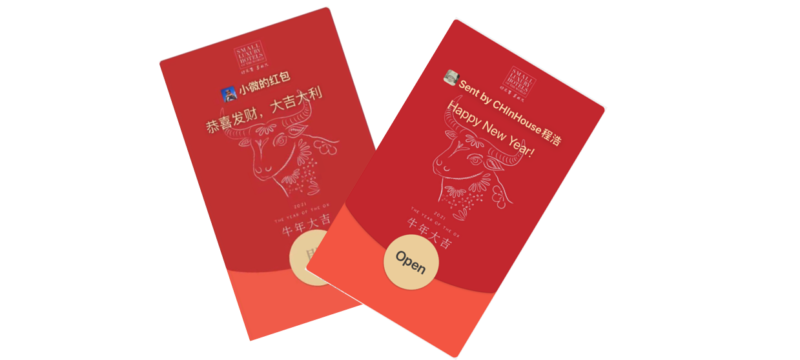 One important Chinese New Year promotion is the giving of hongbao, or red envelopes, containing cash. These days, this exchange has also gone digital, with WeChat launching a red envelope function in 2014. In 2019, 823 million people sent or received red envelopes via WeChat during Chinese New Year. WeChat users can now select and save specially designed digital red envelopes to use when sending these gifts, and Dragon Trail designed a Year of the Ox digital envelope branded for SLH that can be saved, sent, and received by anyone.