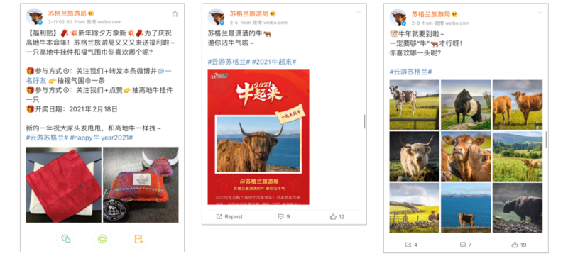 In the Year of the Ox, Scotland has the advantage of the fact that Highland cattle are an essential element to the tourism board’s marketing on both Chinese and English-language channels. This meant they already had lots of photos and video footage of beautiful bovines to use for Chinese New Year. They created a special Chinese New Year Highland cattle video shared on WeChat channels and on Weibo. The tourism board partnered with Sina Weibo for a special Year of the Cow poster featuring Highland cattle, and shared a number of cow-related photo posts – including one of steaks in Scotland! The Scottish Government’s international office at the British Embassy in Beijing also made a fun video of a Highland cattle toy pictured all over China, which VisitScotland shared through their own channel.