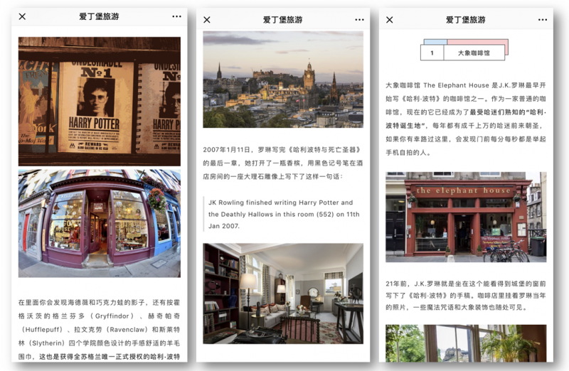 Edinburgh’s November 2018 Harry Potter-themed WeChat post includes locations around the city where JK Rowling wrote, as well as Harry Potter shopping opportunities
