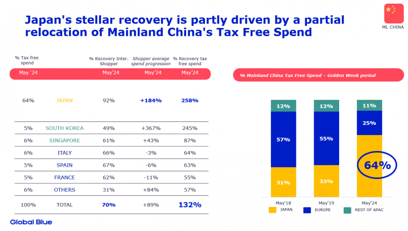 Japan’s weak yen has made it a shopping hotspot for Chinese tourists in 2024. It topped the list of outbound travel destinations for the Labor Day holiday in May and the Dragon Boat Festival in June, and is set to be the most popular summer holiday destination as well. According to data from Global Blue, Chinese tax-free spending in Japan in May 2024 was at 258% of pre-pandemic levels, and accounted for a staggering 64% of all Chinese tax-free spending for the May holiday period. In the meantime, a relatively strong Euro vs. the Chinese yuan also makes East Asia a comparatively more attractive shopping destination.