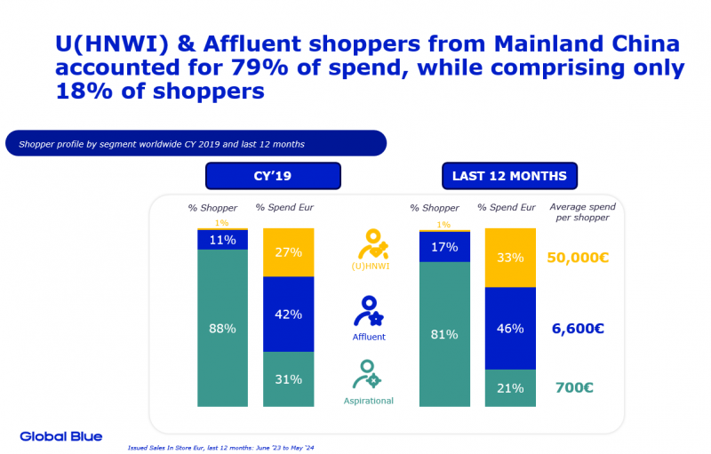 Meanwhile, the most high-end shoppers are spending more than ever. “There’s a concentration of wealth among Chinese shoppers that’s 10% greater than what we saw in 2019,” says Mathieu Grac, noting that 18% of shoppers in the affluent and (U)HNWI categories now account for nearly 80% of tax free shopping spend.
