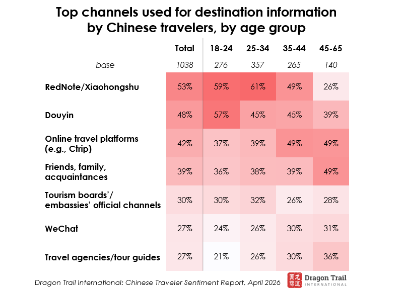 RedNote (Xiaohongshu) remains the top source of outbound travel information, chosen by 53% of respondents in this survey. Following closely are Douyin, and OTAs like Ctrip. Chinese travelers said they were inspired by social media to visit a wide range of places, with content featuring natural scenery the most influential.