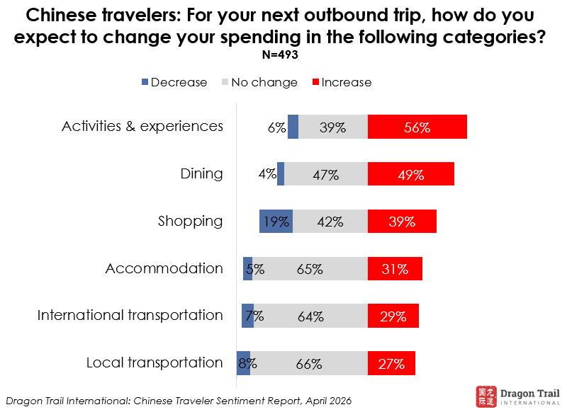 Over half (56%) of Chinese outbound travelers say they are planning to increase spending on activities and experiences, with 49% planning to increase spending on dining. Young travelers aged 18-24 showed a stronger intention to increase spending across all categories – including shopping and accommodation – compared to travelers from other age groups.
