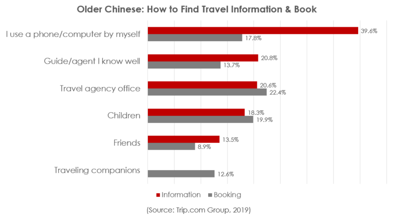 However, booking travel is another story, with less than one-fifth of Chinese over the age of 50 making online bookings. So, how do they book travel? It’s quite a mixed picture, with booking at a travel agent’s office the most popular, followed by relying on their children to book their travel for them. We also see that guides and agents the traveler knows and trusts are important sources of travel information and make some bookings. All of this enforces the importance of B2B marketing and engagement for travel brands, and the fact that the marketing you do aimed at millennials can also impact their parents’ travel.