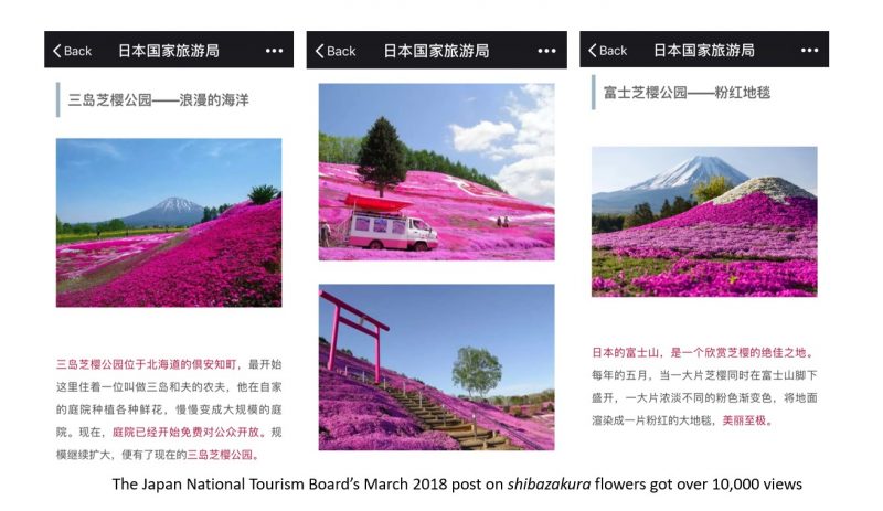 Then in March 2018, the Japan National Tourism Board had another hit with its article on shibazakura, also known as “lawn cherry” or “pink moss”. The cherry blossom season is over too soon, lamented the post, but this pink/purple flower, which covers large swathes of land, peaks in late May – giving followers of Japan’s WeChat account plenty of time to plan a trip. Like the cherry blossom article from the previous year, this post recommended a number of gardens and other top spots to see shibazakura, as well as suggested routes. Japan topped the WeChat rankings for NTOs that week, and the article got over 10,000 views.