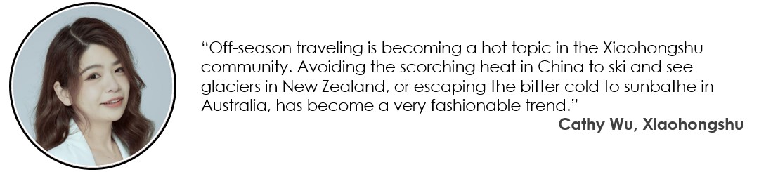 Other than that, off-season traveling is becoming a hot topic in the Xiaohongshu community, especially for off-season traveling in New Zealand and Australia. More and more young people on Xiaohongshu hope to spend more time and money to enjoy a more comfortable and relaxing travel experience. Therefore, avoiding the scorching heat in China to ski and see glaciers in New Zealand, or escaping the bitter cold to sunbathe and see penguins in Australia, has become a very fashionable trend.