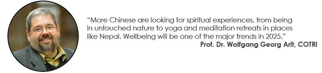 Chinese society has turned from optimism to anxiety. As a result more Chinese are looking for spiritual experiences, from being in untouched nature to yoga and meditation retreats in places like Nepal. Wellbeing, which encompasses more than just wellness, will be one of the major trends in 2025.