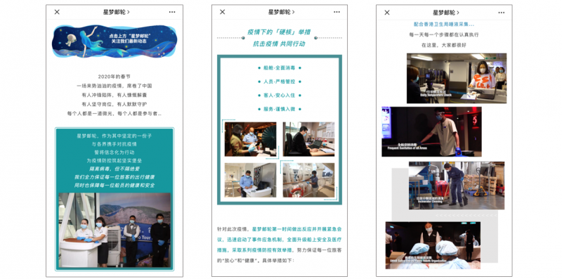 Several cruise lines were very quick to respond to the first announcements about the virus and Wuhan quarantine. On 22 January, Costa Cruises published an article on their B2C WeChat account, offering free refunds or changes to any dates before the end of 2020, to anyone from Wuhan; who didn’t pass the health exam at the port; who had coronavirus or contact with someone who did in the previous 14 days; or anyone whose work was affected by coronavirus so that they couldn’t travel (e.g., healthcare workers). Dream Cruises, MSC, and Viking Cruises all made similar announcements about the situation on their consumer accounts on 23 January, and Viking Cruises also canceled its February offline marketing events in China at the same time.