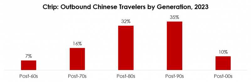 In 2023, Ctrip’s outbound travelers were 56% female and 44% male. The Chinese outbound tourism market usually skews female, but the report notes that the gender gap in 2023 was even bigger than in 2019.