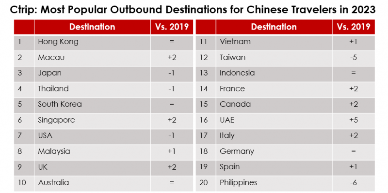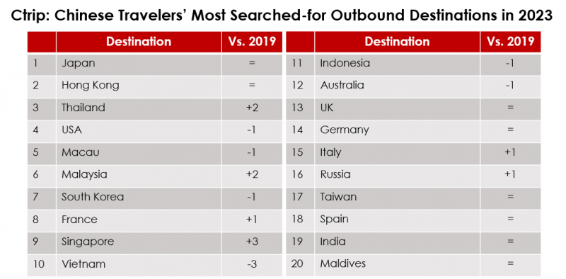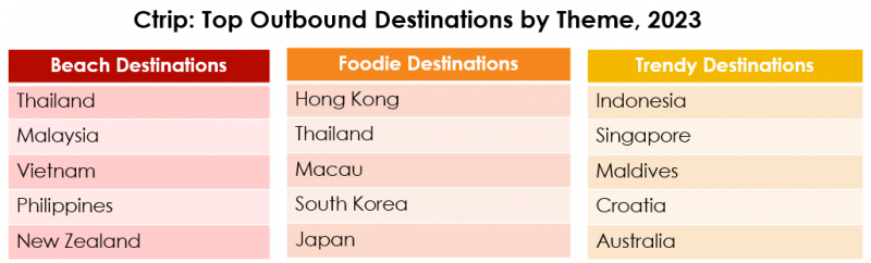 The destinations with the greatest search volume on Ctrip in 2023 weren’t wildly different from the most visited destinations, but there was a greater stress on long-haul countries here, with the US in 4th, and France in 8th.