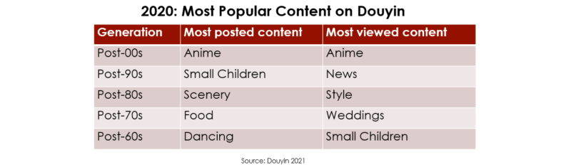 How do different generations use the app? Based on the most-posted content types, it looks like the 1980s and 1970s generations may be most likely to use Douyin to post travel-related content.