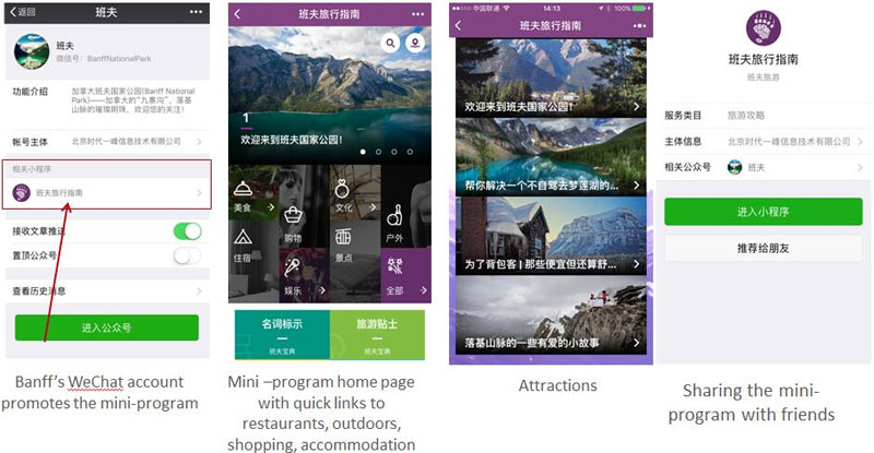 Canadian national park, Banff & Lake Louise Tourism has been one of the first overseas travel destinations to launch a WeChat mini-program. This mini-program serves as an interactive, digital brochure to help visitors keep up to date with the park’s activities, and it is promoted on Banff’s WeChat account. Users have access to a directory with quick links to activities, restaurants, accommodation, shopping, attractions and more useful information, and they can also create and save itineraries. An LBS function provides location-based recommendations for visitors at the destination, which helps local providers to reach a Chinese audience. A map function and photos of attractions, restaurants and other destinations allows visitors to visualize and plan their time at Banff and Lake Louise most effectively.