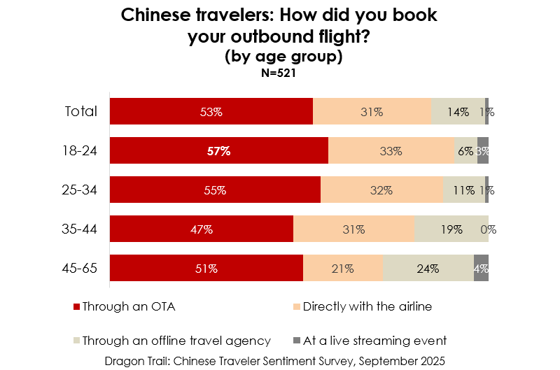As for booking channels of last international flight, 53% of surveyed outbound travelers chose OTAs, while 30% booked directly through airline websites. Offline travel agencies were selected by 14% of travelers overall, but this percentage is significantly higher among travelers aged 45-65, with 24% of this age group opting for traditional travel agencies.