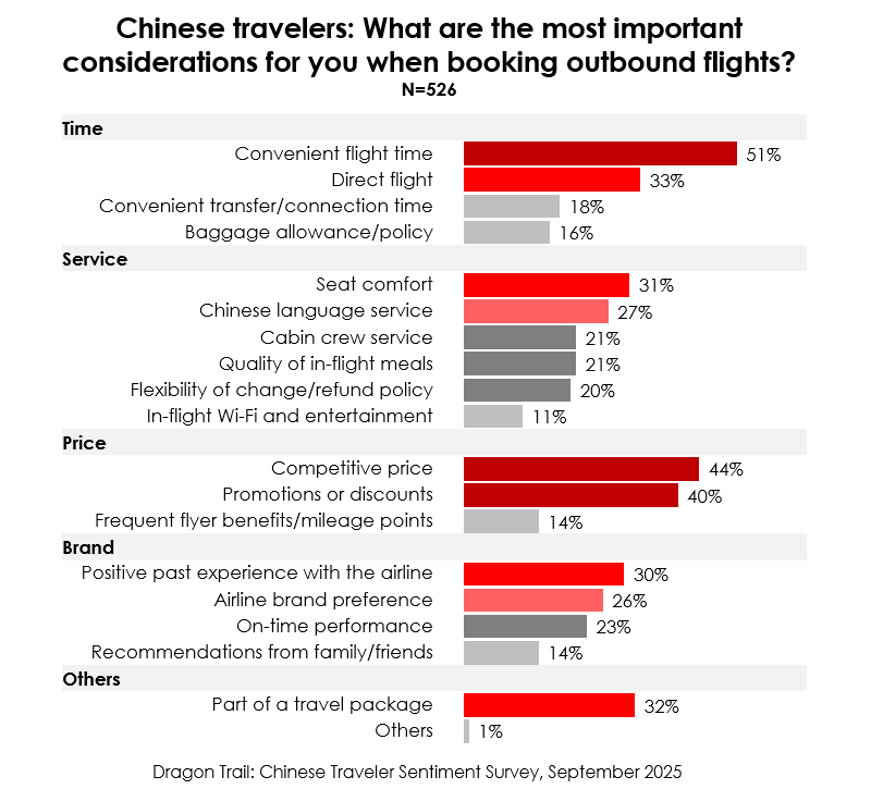 What are the important considerations for Chinese outbound travelers when booking outbound flights? 51% of outbound travelers consider a convenient flight time to be the most important factor. Next on the list is price, with 44% prioritizing outbound flights with competitive prices, and 40% seeking promotions or discounts during booking. Other key considerations include direct-flight availability (33%), seat comfort (31%), and previous positive experiences with the airline (30%).