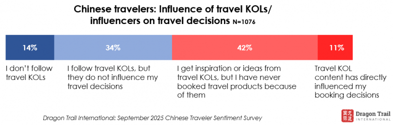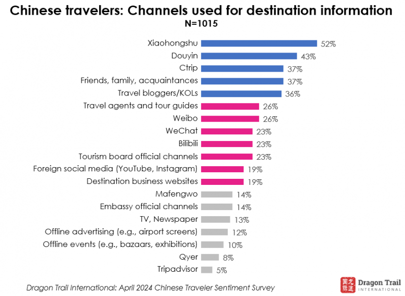 Influencer content is certainly one of the most important sources of information and inspiration for Chinese outbound travelers. Dragon Trail’s consumer research from 2024 found that in terms of influences on outbound destination choice, promotions by Key Opinion Leaders (KOLs) was the most influential kind of marketing, and significantly more effective than content published directly by a tourism board or embassy. When it came to looking for destination information, again KOLs were one of the top sources, chosen by 36%, just below Ctrip and personal friends, family, and acquaintances.