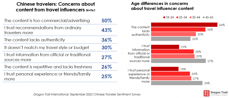All respondents expressed concerns about overly commercial content (50%) and lack of authenticity (36%) from online travel influencers. Concerns about authenticity were most prominent for travelers aged under 25, chosen by 44% of those aged 18-24.