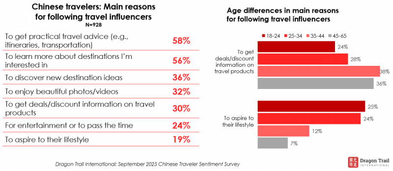 Our survey data highlights significant divergences among different generations of Chinese travelers and how they interact with influencer content. Travelers aged 35 and up are more likely to follow influencers for travel deals and discounts (38% of respondents aged 35-44, compared to 24% of those aged 18-24), while younger travelers aspire to KOLs’ lifestyles (25% of respondents aged 18-24, compared to just 7% of those aged 45 and older).