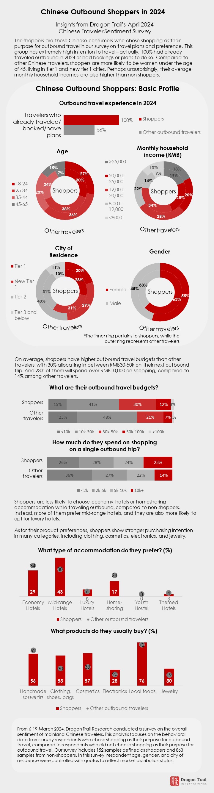 Who are the Chinese outbound travelers who choose shopping as one of their primary reasons for traveling internationally, what are their travel plans for 2024, how big are their budgets, and what do they buy? We analyzed data from Dragon Trail’s spring 2024 Chinese Traveler Sentiment Survey to deliver new insights on Chinese outbound shopping behavior and traveler profiles.