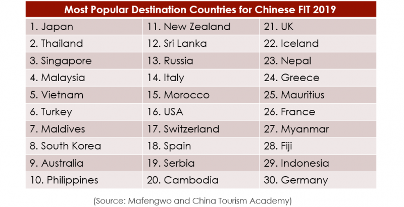 The report’s list of most popular destinations for FIT reveal a few surprises. For example, Morocco – which attracted 200,000 Chinese tourists in 2018 and sees a majority of group tourists, not FITs – ranks higher on the list than the US, a well-established FIT destination with around 3 million Chinese arrivals each year. Although the report is published together by Mafengwo and the China Tourism Academy, the data likely comes from Mafengwo’s website and could be influenced by promotions for certain destinations. The report also just lists the countries as “the hottest FIT destinations,” but doesn’t explain if the ranking is based on searches, bookings, page views, or any other factors.